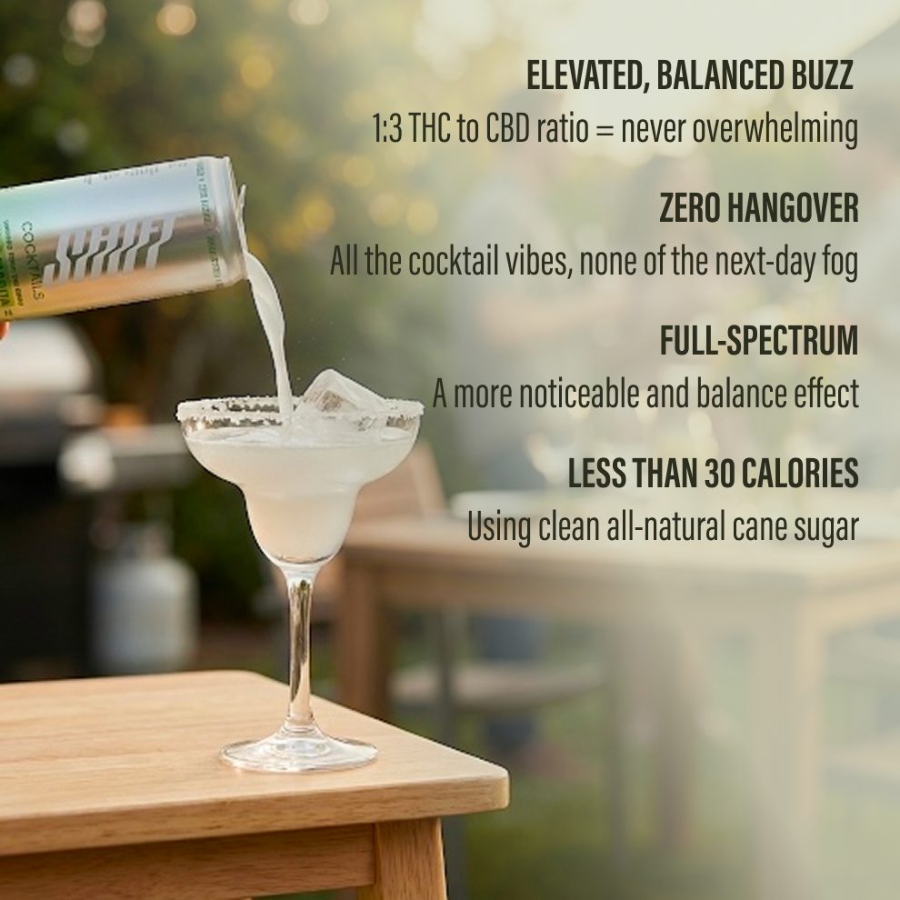 Shift Cocktails are crafted for those who want to unwind without alcohol. Infused with a 3:1 ratio of CBD to THC, these drinks deliver a balanced, mellow lift—making them a perfect alternative to traditional cocktails. Whether you're socializing with friends and family or winding down after work with the crew, SHIFT helps you relax without the next-day sluggishness or regret.
